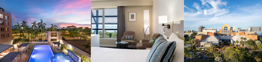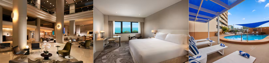 Bicentennial Park, Darwin Convention Centre, and the beach at Darwin Waterfront Precinct are within three kilometres. The Hotel facilities include an outdoor pool on a high floor, the signature restaurant Pepper Berry Restaurant offers modern Australian cuisine with native bush spices, while Palm Court Bar & Lounge serves cocktails and snacks.